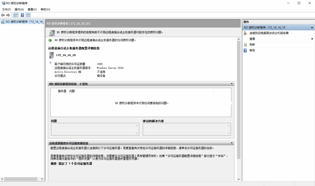 打开远程桌面授权诊断程序,如果显示未识别到任何授权问题,说明配置是有效的。