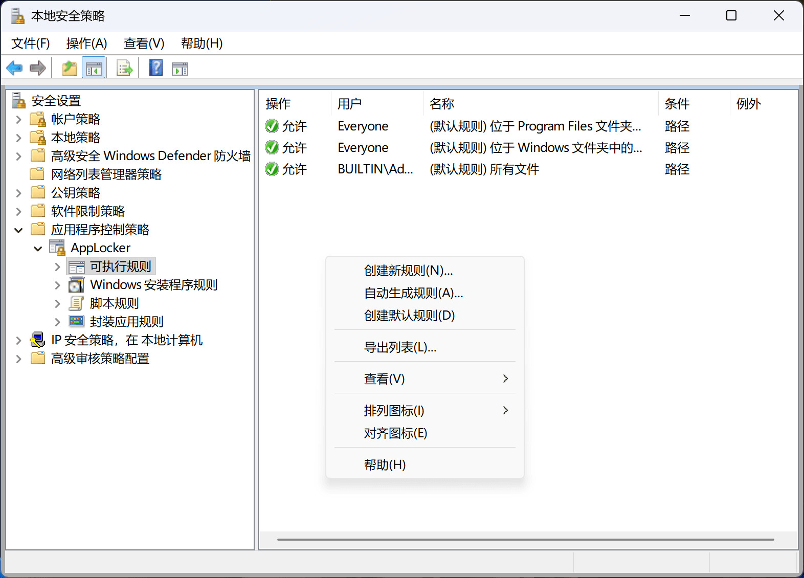 AppLocker 并不会默认创建一套规则,但这不代表 AppLocker 没有默认规则!直接在空白区域右键,然后选择“创建默认规则(D)”就可以了!