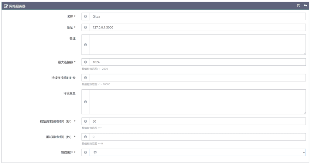 127.0.0.1:3000(Gitea 监听的地址)。 - 最大连接数:字面意思,这里照着填写就行。
