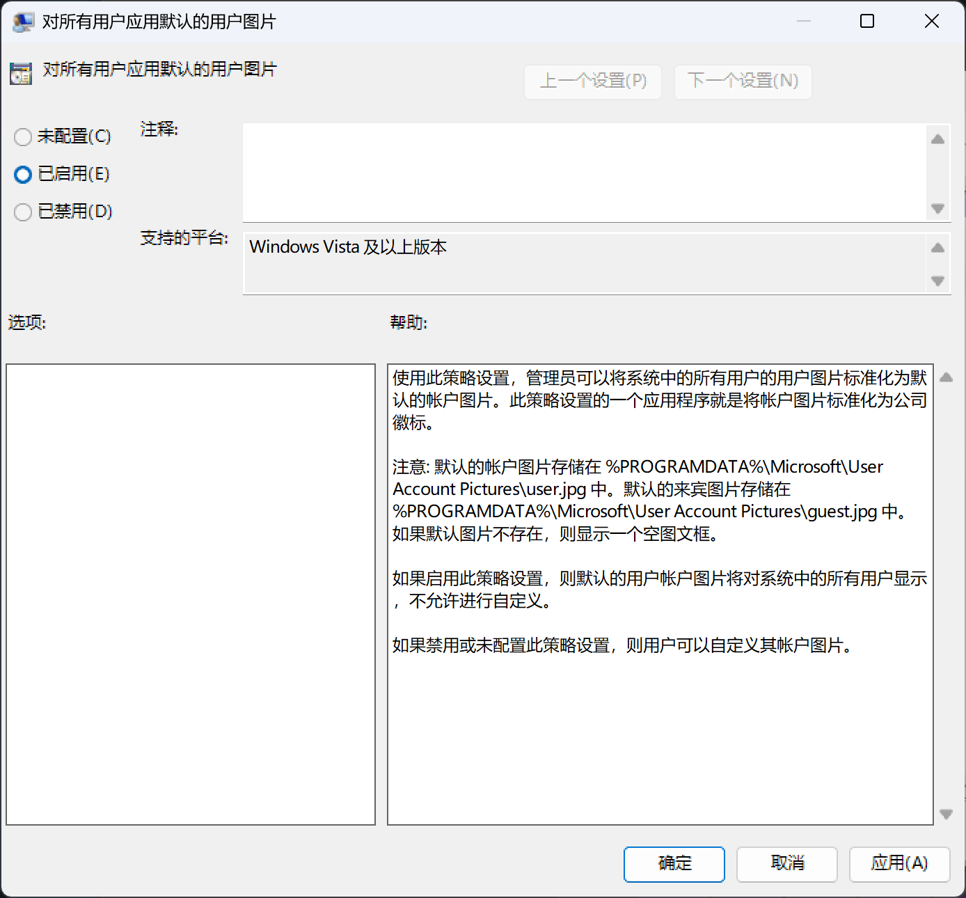 不过这个策略并没有允许我们直接指定一个头像,相反,这个策略的实际作用是强制应用 Windows 默认的一套头像,对就是那个灰色小人,位置也已经在策略说明中列举了出来。