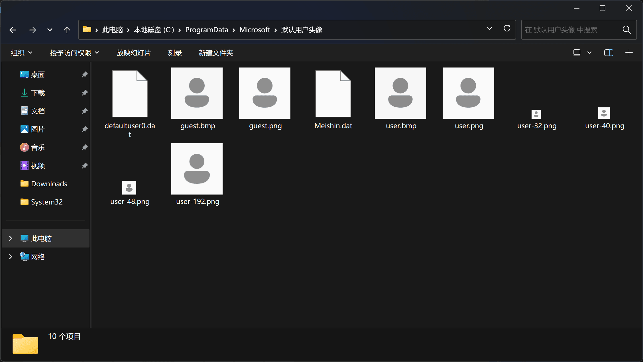 需要注意的是至少从 Windows 10 开始默认头像的格式就不是像策略说明那样简单的一个 .jpg 了(Windows 7 才是这样的),而是一系列 .png,如果需要修改的话那么所有东西都需要替换。