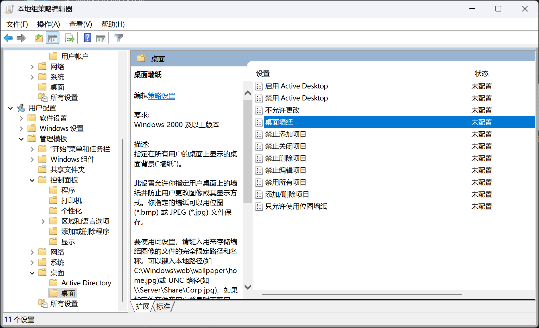 这个策略位于“用户配置” > “管理模板” > “桌面” > “桌面”(没有多打)。