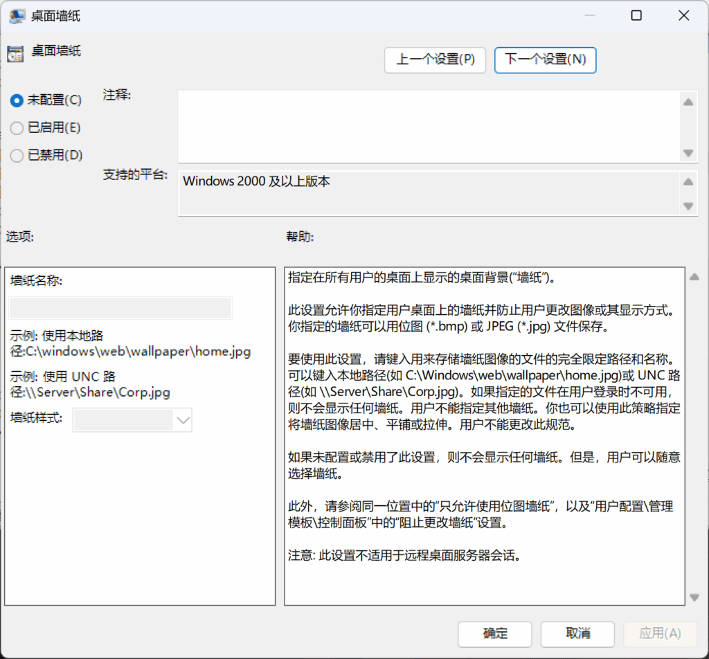 话是这么说,不过仔细琢磨一下,就会发现,“使用默认壁纸“和”禁止修改壁纸“还是有一点微妙的区别的。如果你更乐意设置默认壁纸那么就可以用这个选项,虽然要记得把壁纸文件放在一个标准用户不可写的位置。